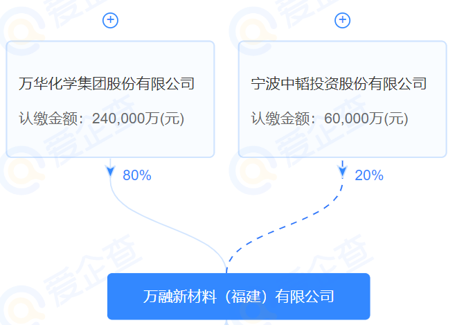 從愛企查官網(wǎng)所知,萬融新材料(福建)有限公司屬于萬華化學(xué)控股子公司,注冊時(shí)間為2021年3月31日,注冊資金30億元,注冊地址位于福建省福州市福清市江陰工業(yè)集中區(qū),萬華化學(xué)、寧波中韜兩家企業(yè)控股,其中萬華化學(xué)占股80%。