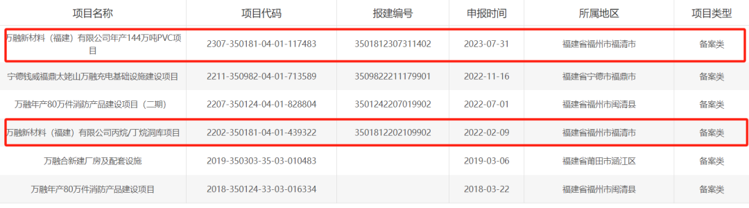 另外,從福建省投資項(xiàng)目在線審批監(jiān)管平臺(tái)得知,萬融新材料還有“年產(chǎn)144萬噸PVC項(xiàng)目”、“丙烷/丁烷洞庫項(xiàng)目”這兩個(gè)項(xiàng)目分別于2023年7月31日、2022年2月9日進(jìn)行了項(xiàng)目備案。